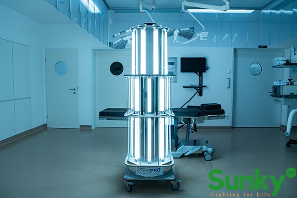 Hệ thống chiếu sáng diệt khuẩn UV-C ở dạng di động được sử dụng phổ biến trong ngành y tế và kiểm soát dịch bệnh công cộng. Các thiết bị này được gắn đèn chiếu sáng UV-C và linh hoạt trong việc di chuyển từ vị trí này đến vị trí khác để khử trùng cho nhiều không gian khác nhau. Phổ biến nhất là khử trùng diệt khuẩn cho các bệnh viện hoặc cơ sở y tế. Ví dụ: Phòng phẫu thuật của bệnh viện, sau khi các bác sĩ hoàn thành ca mổ cho bệnh nhân thì thiết bị gắn đèn khử trùng sẽ được đem tới và bật chế độ hoạt động để khử trùng bề mặt vật dụng cũng như không khí trong không gian đó.